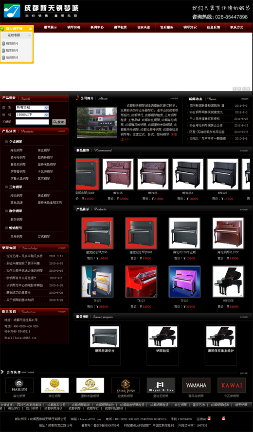 成都西部新天琴行有限公司—(前身为:成都川音新天乐器有限公司),是由成都新世纪琴行与成都天音琴行共同出资组建,其前身新世纪琴行和天音琴行均建立于一九九七年,是西南地区建立较早,发展较快的专业乐器琴行。主营立式、卧式、数码钢琴。旗下拥有十多家分行,营业面积累计超过10000平米,经营的知名钢琴品牌有日本YAMAHA”钢琴、“KAWAI”钢琴、 唯一进入维也纳金色大厅的国际知名品牌—“海伦”钢琴、韩国世正“维瓦切”钢琴、韩国英昌“伯格曼”钢琴、星海粤华乐器有限公司荣誉出品“海乐尔”钢琴、上海钢琴公司“海立”钢琴、“美罗迪”钢琴、烟台龙凤“金斯波格”钢琴、上海“曼格尼”钢琴、“歌德”钢琴、“施特劳斯”钢琴、广州 “珠江”钢琴 、浙江 “拉奥特”钢琴等二十余个钢琴品牌,营销网络遍及全国近二十个省市地区。