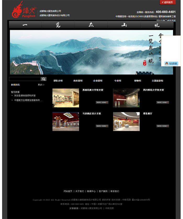 成都烽火展览有限公司——始创于2006年,是一家专业从事展览展示及各类大型博物馆、陈列馆、科技馆、企业文化展厅、展览馆、部队军史馆、师史馆、团史馆、警史馆、部队政治环境建设以及会议庆典、公关活动、导视系统等整体策划、设计、施工等一体化的综合服务机构。自创立伊始,始终秉承“创新、务实、高效、诚信”的公司理念,凭借专业的技能、丰富的经验、对市场敏锐的触觉及对客户需求的了解,审时度势,抓住有利契机,在成都展览展示领域占有一席之地。并以“专业、敬业”之态度精神得到了业内人士及商家客户的广泛认同与赞誉。