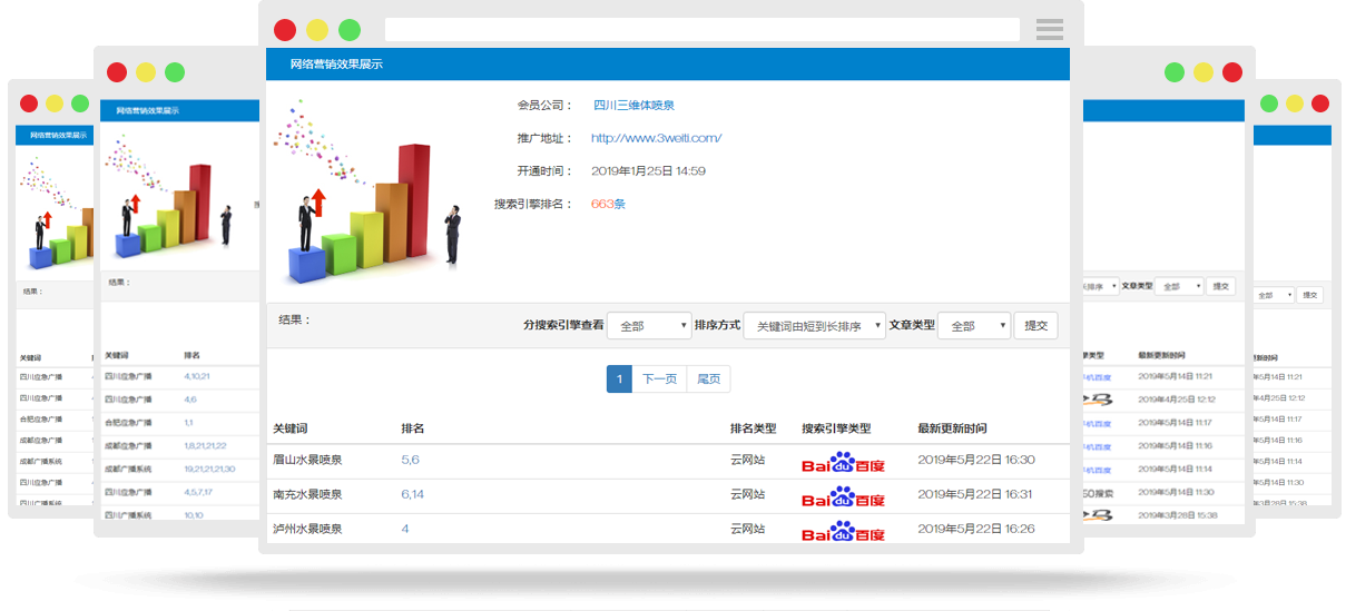 关键词排名覆盖百度、360搜索、搜狗搜索、GOOGLE、YAHOO、必应、中国搜索7大搜索引擎,其中包括电脑端和手机端,全网推广不留死角。网总管只针对百度、360搜索、搜狗搜索3大平台排在首页才计费,其它平台全赠送。